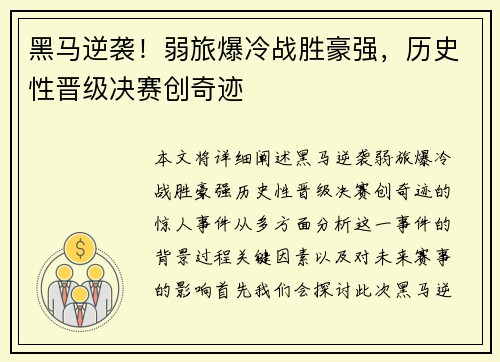 本文将详细阐述“黑马逆袭,弱旅爆冷战胜豪...