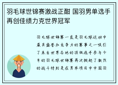 羽毛球世锦赛一直是羽毛球运动中最具盛誉和...