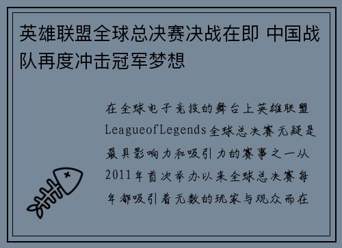 在全球电子竞技的舞台上,英雄联盟(Lea...