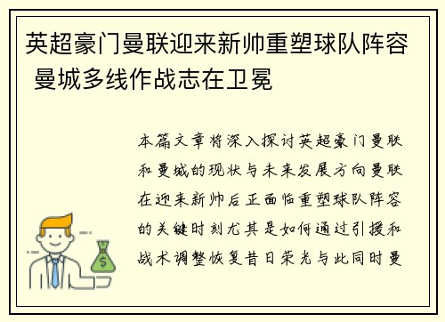 本篇文章将深入探讨英超豪门曼联和曼城的现...