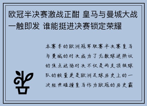 本赛季的欧洲冠军联赛半决赛,皇马与曼城的...