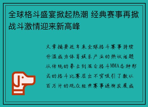 文章摘要:近年来,全球格斗赛事持续升温,...