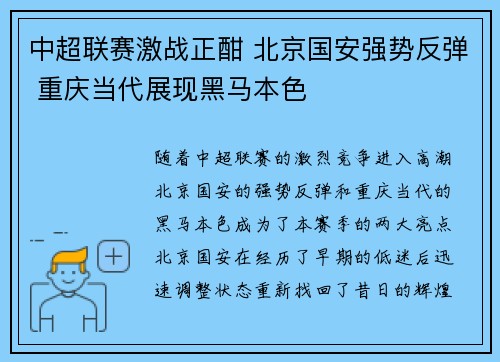 随着中超联赛的激烈竞争进入高潮,北京国安...