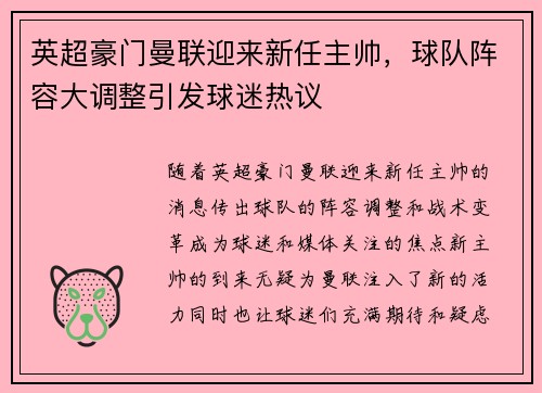 随着英超豪门曼联迎来新任主帅的消息传出,...