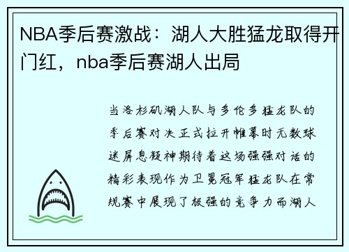 当洛杉矶湖人队与多伦多猛龙队的季后赛对决...